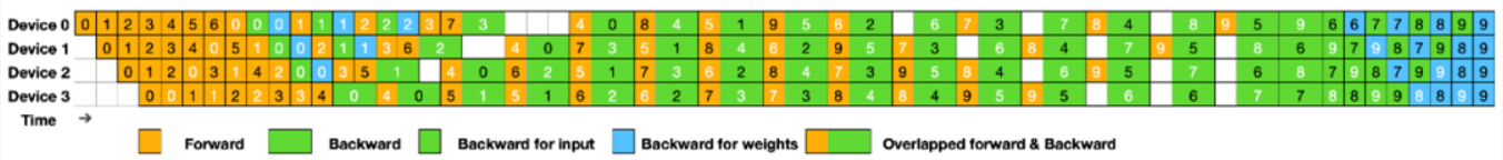 借鉴 Zero-Bubble Pipeline Parallelism[3]的思想,MXMACA集成了ZBH1(Zero Bubble H1)方案: