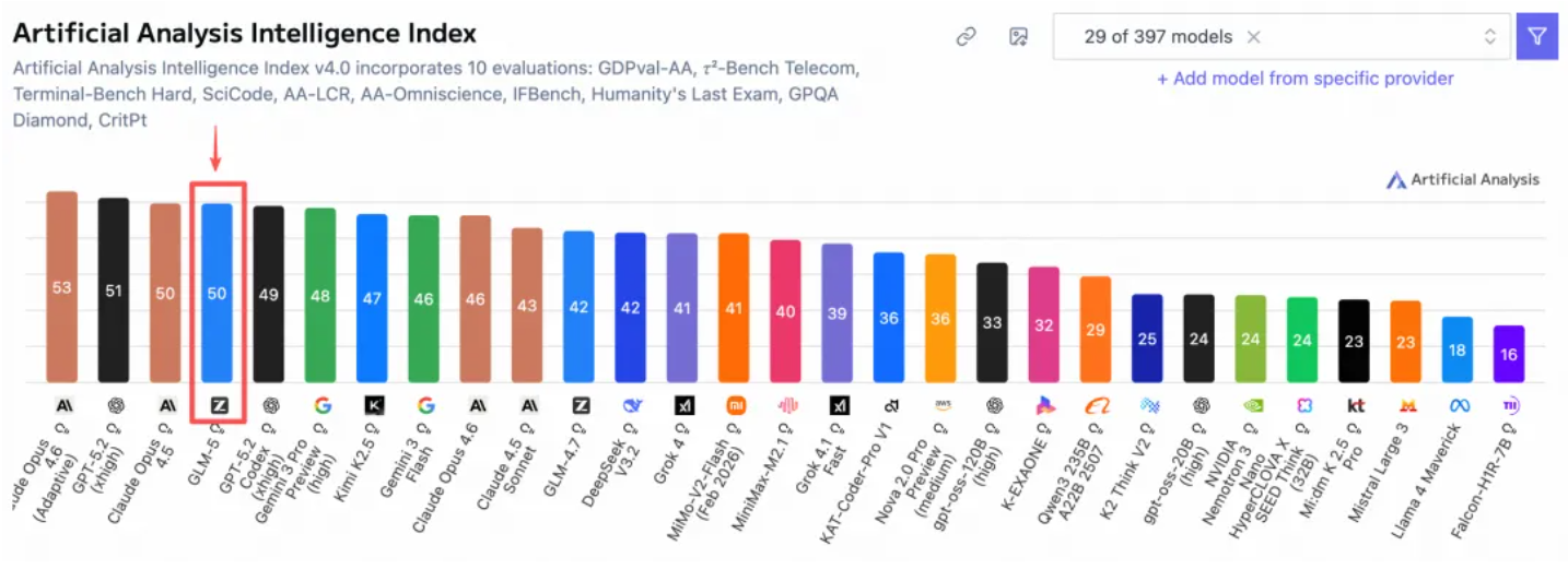在全球权威的 Artificial Analysis 榜单中,GLM-5 位居全球第四、开源第一。